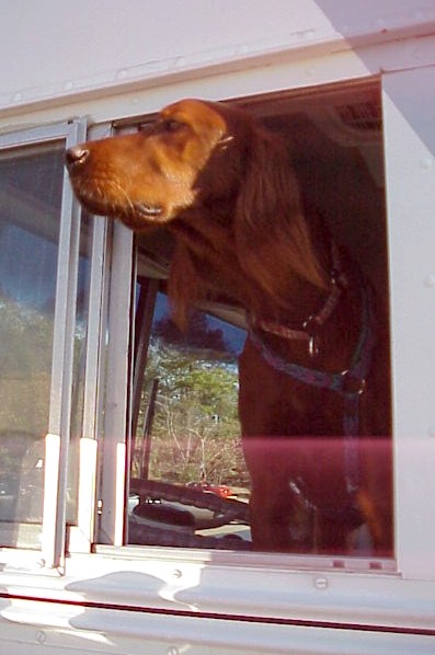 Doogan is quite the traveler, he lives in Maine, and goes to New Mexico each year. We are the lucky ones, we get to see him on his way across the US as he travels! My favorite place to hang out is in the truck...they can't go anywhere without me if I'm sacked out in there...I love my life in Maine. Lots of smells in the woods, lots of birds in the fields....so many cats in town, I NEVER forget where I saw one last! There are LOTS of them here!!! Mom doesn't appreciate it when I drag her down the sidewalk after one...but she gets over it! All I have to do is be cute! Yesterday was my birthday! Mom and I took a special walk, a new place, where not too many people go, so much to check out, chased a squirrel and could smell bunnies! We enjoyed ourselves... We are going to New Hampshire soon, I get to chase the "chippies" down there, go swimming in water that I can actually drink! and torture Grandpa's dog Kate. I met a new friend today, a young Airdale girl, also 2, we really hit it off, shes our new neighbor, I think I will get to play with her someday soon, she is from Alaska!