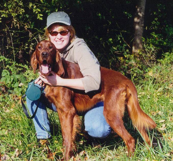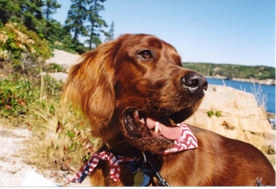 My name is now Finn, short for Finnbharr, which is an Irish name. I was originally picked up as a stray in PA; I was very thin and had little hair due to fleas, I was scared of water and big men. Fortunately, Sandy in PA saved me and now I am very happy. I live in NJ with Millie the cat. I go to work every day with my dad and have my own couch and bed! I go on walks in the woods every day too; I don’t even have to be on a leash. I love to chase squirrels, rabbits and fox but I’m really afraid of hot air balloons. My dad says I'm real smart and listen well. People I meet can’t believe I’m adopted. Every St. Patrick’s Day I march with Deanna and Phil’s setters and lots of other adopted dogs in the parade. Its lots of fun! I am pictured here hiking in Acadia Park in Maine and with my Mom who is Irish too!