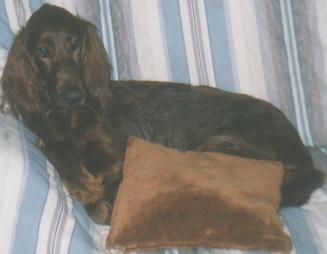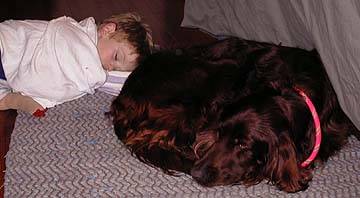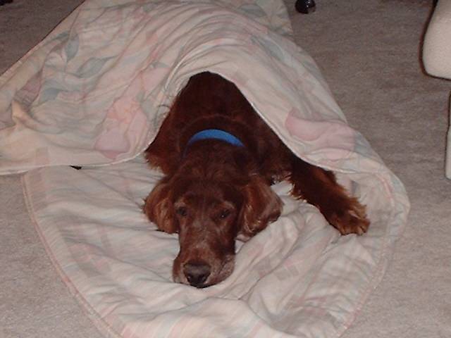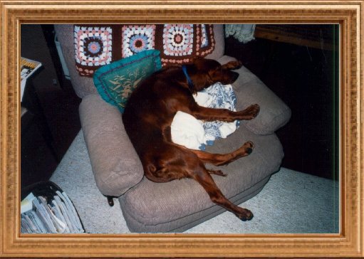 Hi! I am Riley, started out as Rocky in Michigan. My first owners didn't know what an Irish Setter was like, but my new family absolutely adores me. I figure if I close my eyes, they won't see my up on the table. Photo by Sue and MaryAnn 12/99.