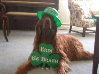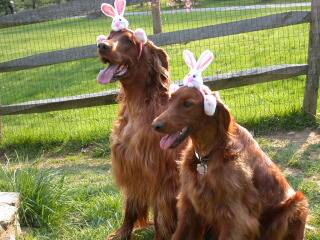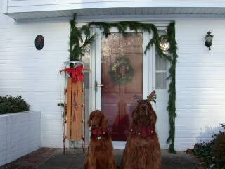Here is a picture of Shamus and Sheila in front of the fireplace with their heart garlands on. Enjoy. Shamus will be 8 years old in May. Has shown in Novice, has his CGC degree and TDI. Will be working soon at nursing homes in the West Chester area. Both dogs attend the Chester County Dog Training Club. I am a member of the club. Sheila will be 2 in May. Rescued her at 6 months of age. Would not even come into the house at first, chewed decorated pillows, dug holes outside. Now, Shamus's best buddy, never chews anything, no more outside holes and just got her CGC degree and is working on her CD in Novice. What a turn around. Lovable and gives many kisses. Even through her shyness, she never showed any aggression towards man or beast. Nancy, and Irish Shamus and Sheila in Westtown, PA